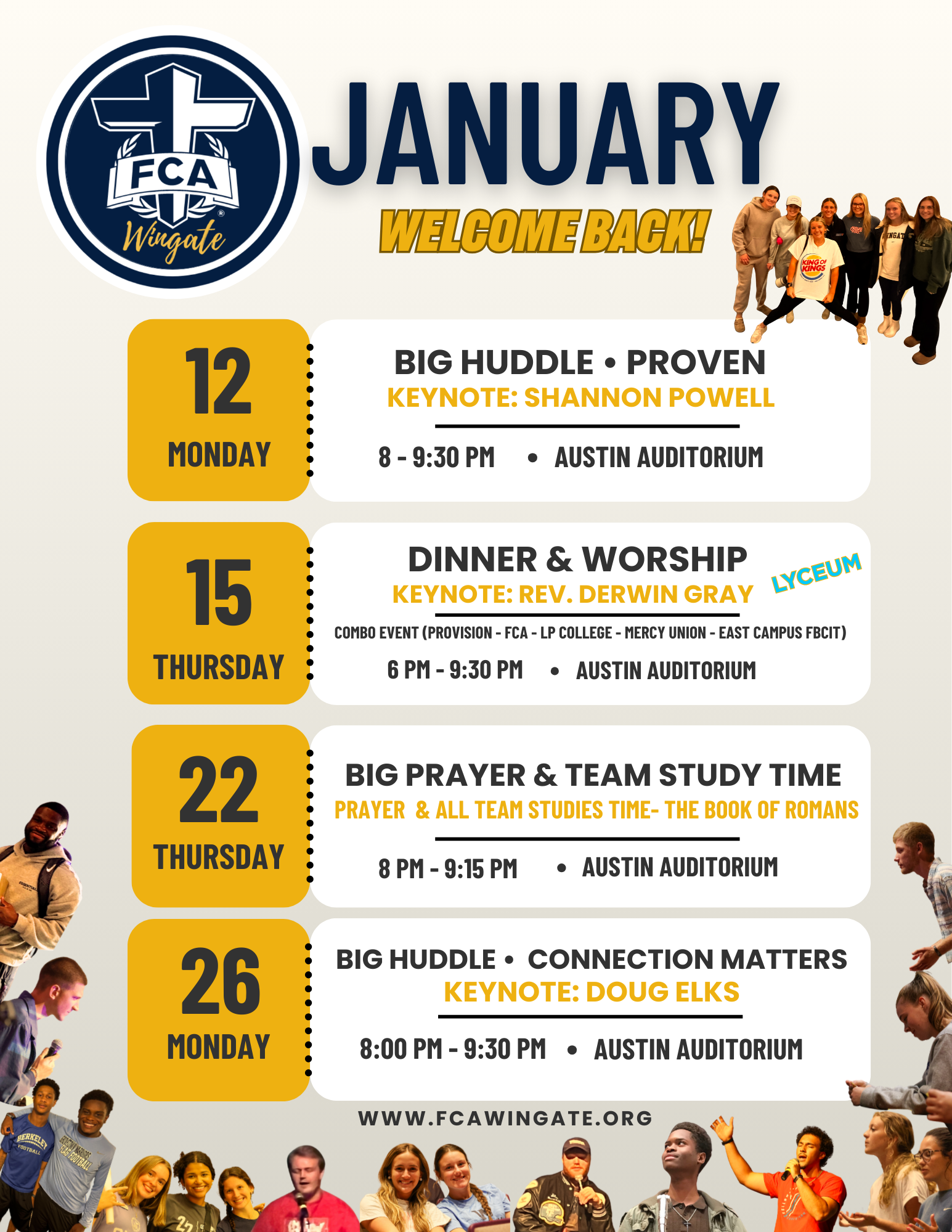 We invite EVERYONE of our Coaches, Rostered & Non-Rostered Athletes, Fitness For Life Students, Alumni, Character Coaches, Wingate Administration & Faculty, Donors, Volunteers, Church Partners, Friends, and Family to join us in prayer daily on the 19th hour and 54 minute (7:54 p.m.) for our FCA ministry on the Wingate University Campus.